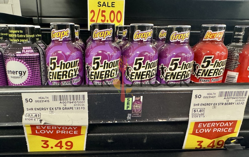 Bottles of grape flavored 5-hour Energy drink on an impulse isle at a King Soopers grocery store in Denver, Colorado. November 2025. Full size image: 3908 × 2471 Pixels JPG.