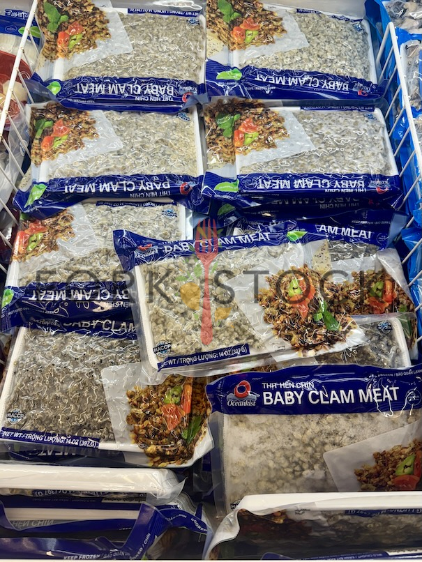 Packages of Oceankist Thit Hen Chin baby clam meat on display at a Vietnamese market in Denver, Colorado. November 2025. Full size image: 3024 × 4032 Pixels JPG.