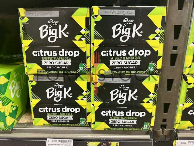 Boxes of Kroger brand Big K Citrus Drop zero sugar zero calories naturally flavored soda at a King Soopers grocery store in Denver, Colorado. November 2025. Full size image: 5053 × 3790 Pixels JPG.