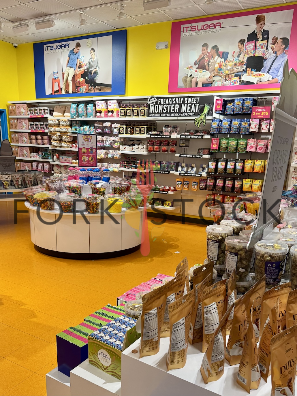 A variety of candy on shelves with halloween decor at ITSUGAR at September 2005. Full size image: 3434px  ×  4579px.