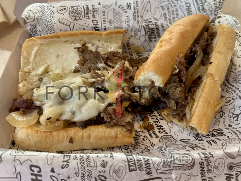 A Philly cheese steak sandwich from fast food chain “Charley’s Philly Steaks”. Contains bread, mayonnaise, steak, cheese, onions. Littleton, Colorado. November 2025. Full size image: 4284 × 3213 Pixels JPG.