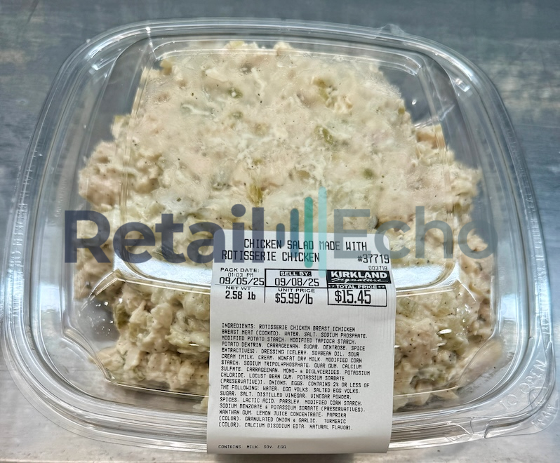 Chicken salad made with rotisserie chicken at a Costco warehouse. September 2025. Full size image: 3991px × 3300px.