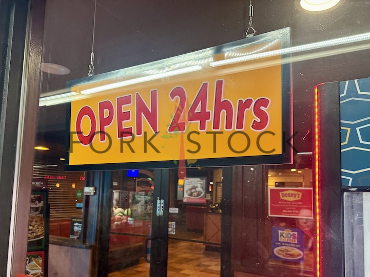 A Denny’s diner “Open 24hrs” sign hanging in the exterior of the restaurant. Denver, Colorado. November 2025. Full size image: 4805 × 3605 Pixels JPG.