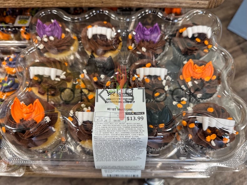 A tray of a dozen mini halloween themed cupcakes with chocolate buttercream icing and spooky decorations with focus on the pricing and ingredient label. Taken at a King Soopers grocery store in Denver, Colorado. October 2025. Full size image: 5259  ×  3944 Pixels JPG.