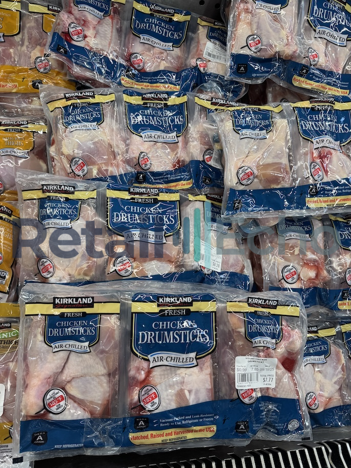 Kirkland fresh frozen air chilled chicken drumstick packages on display at a Costco in Denver, Colorado. September 2025. Full size image: 4284px × 5712px.