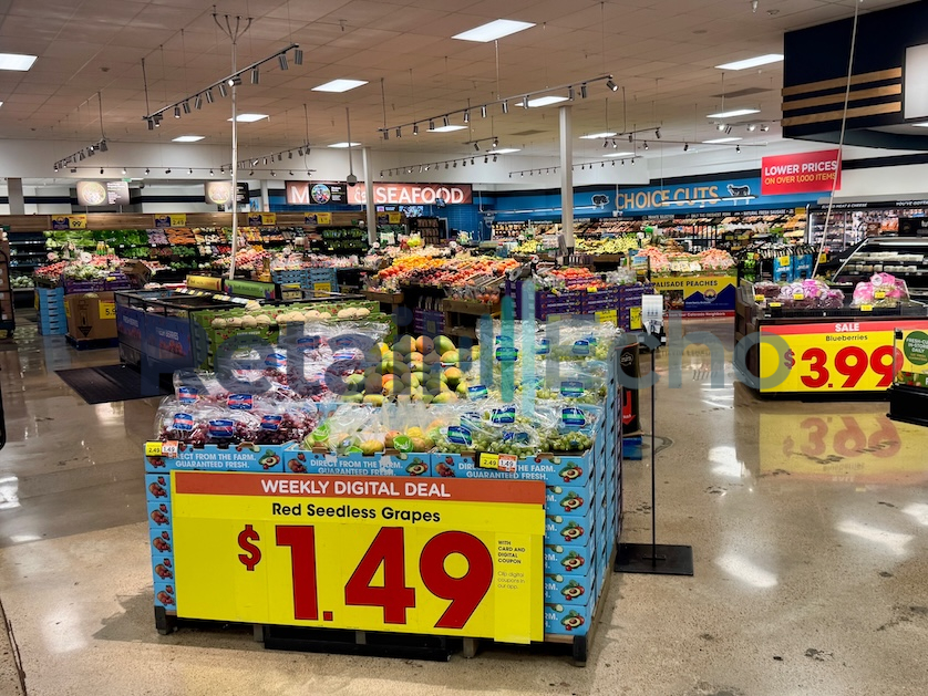 A vegetable and fruit department in a grocery store. Also showing seafood department and the deli. September 2025. Full sized image 4190px × 3143px
