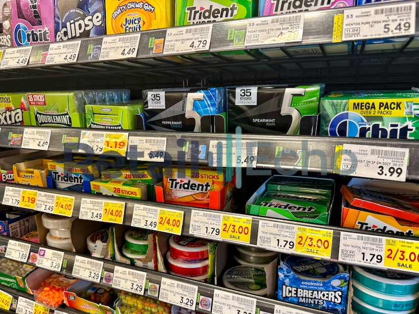 A variety of gum and displayed on an impulse isle at a grocery store. Products shown are trident, orbit, wrigleys, icebreakers and breath savers.
