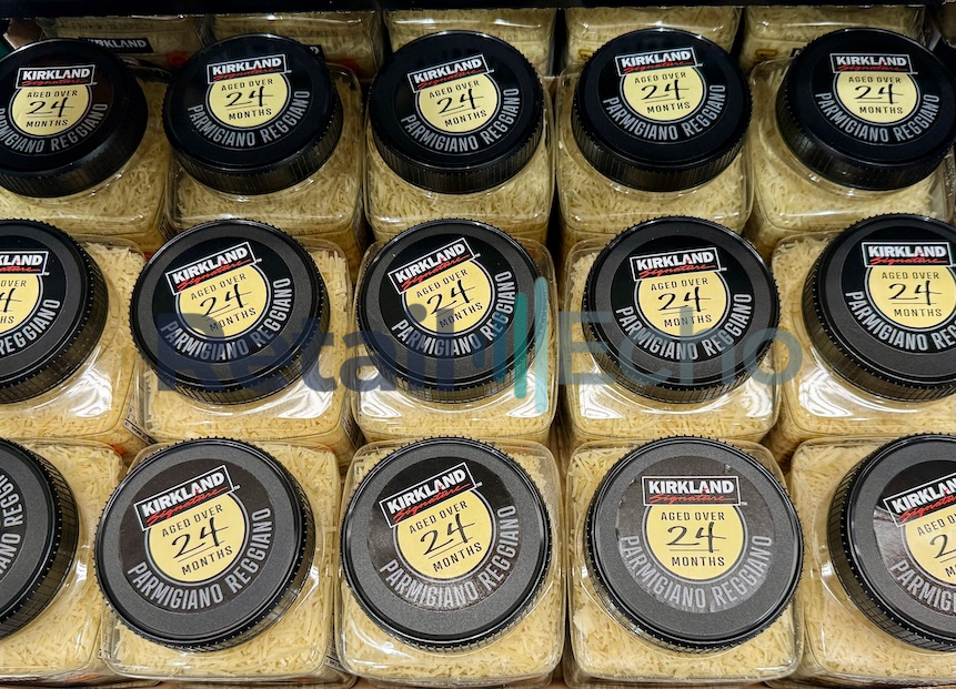 Kirkland brand 24 Month Aged Parmigiano Reggiano Containers In A Fridge At A Costco. Denver, Colorado. September 2025. Full size image: 4306px × 3104px.