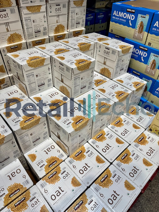 A pallet filled with boxes of Kirkland brand organic non-dairy beverage with rolled oats. Full sized image: 4284px × 5712px.