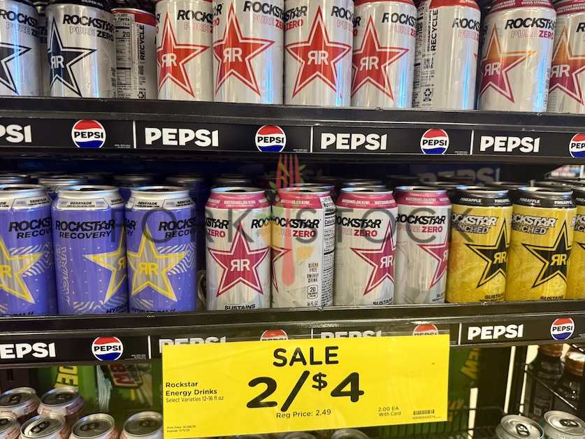 Rockstar Energy drink cans of various flavors (Pure Zero, Fruit Punch, Tangerine Mango Guava Strawberry, Rockstar Punched Pineapple, Watermelon Kiwi, Rockstar Recovery Berry Aid, Zero Ice) on display at a King Soopers grocery store in Denver, Colorado. October 2025. Full size image: 5579  ×  4184 Pixels JPG.