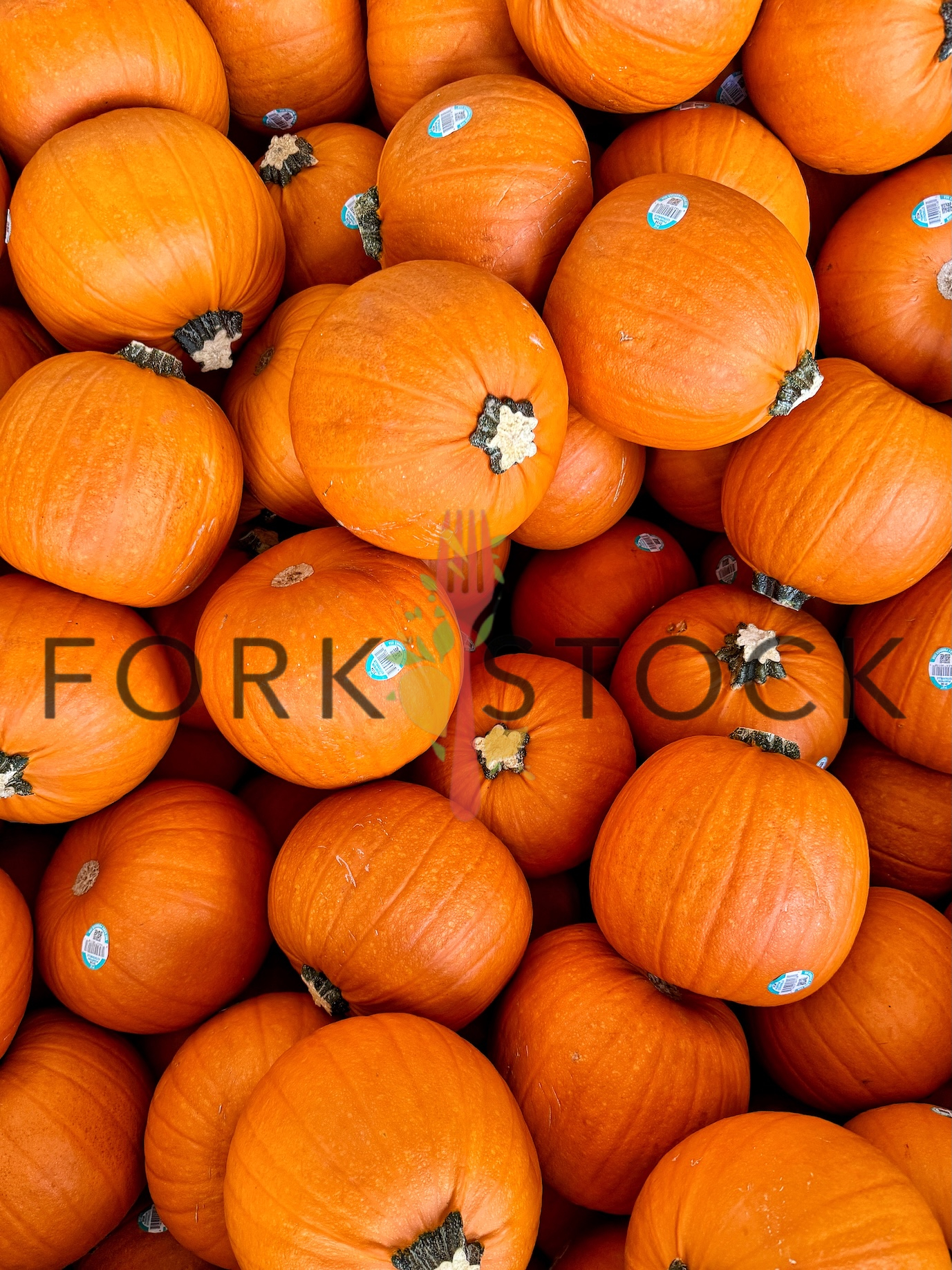 A selection of small pie or sugar pumpkins shown grouped together in a pallet. Colorado 2025.