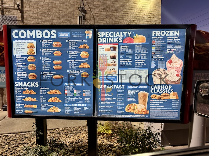 A Sonic drive thru static menu board showing a selection of items for order. Denver, Colorado, November 2025. Full size image: 5712 × 4284 Pixels. Items include beef burgers, chicken sandwiches, snacks, classic drinks, brewed iced teas, kids meals, speciality drinks, cold coffees, signature limeades, slushes, breakfast foods, frozen drinks and carhop classics.