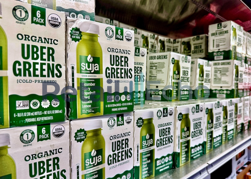 Cases/Cartons of Suja Organic Uber Greens (Cold-Pressed) at a Costco. Denver, Colorado September 2025. Full size image 5135px × 3667px.