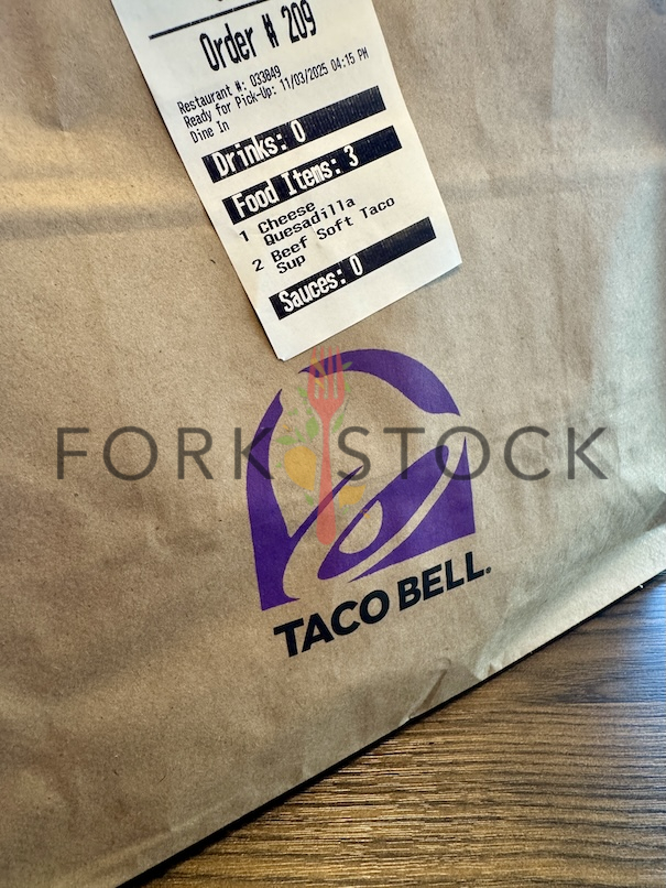 A close up photo of a Taco Bell take out paper bag and order details ticket showing a cheese quesadilla and two beef soft taco supremes. Denver, Colorado. November 2025. Full size image: 3024 × 4032 Pixels JPG.