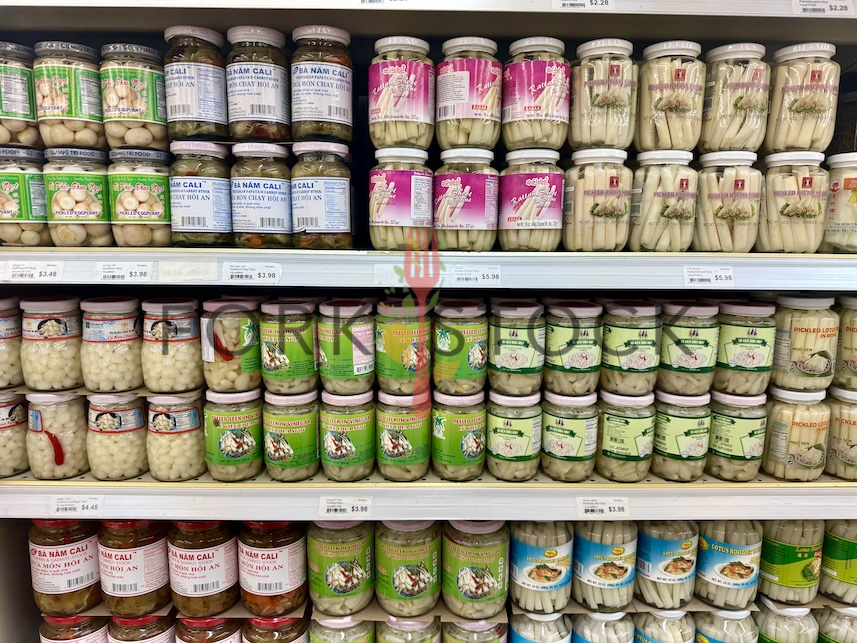 Various jars of vegetables on display on an isle at a Vietnamese market in Denver, Colorado. November 2025. Full size image: 5712 × 4284 Pixels JPG. Items include: Phao Chua Ngot pickled eggplant, Ba Nam Cali vegetarian papaya and carrot stock, Global Pride rattan shoot in brine, pickled rattan shoots, pickled lotus root in brine, Cu Kieu Chua Ngot pickled leek in brine, Cu Kieu Chua Ngot peeled leek in vinegar, pickled leek in brine, Papaya and carrot stock, pickled lotus root in brine.