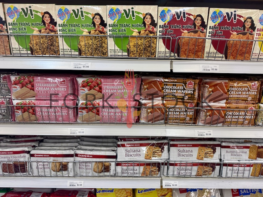 Various Vietnamese snacks on a shelf at a Vietnamese market in Denver, Colorado. November 2025. Full size image: 5597 × 4197 Pixels JPG. Items include Banh Trang Nuong Rong Bien Baked Rice Paper With Seaweed, Imei Bahn Kep Day Tay Strawberry Cream Wafers, Imei Banh Kem So-Co-La Chocolate Cream Wafers, Khong Guan Butter Coconut Biscuits, Sultana Biscuits, Custard Cream Biscuits and Creamy Chocolate Biscuits.